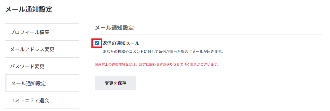 トップ > お知らせ > povoTOWNの使い方詳細 > povoTOWNからのメール通知設定をon/offする方法 ごう@運営事務局 2023/10/19 13:49 povoTOWNからのメール通知設定をon/offする方法 1.マイページから「メール通知設定」をクリックします。 2.「返信の通知メール」のチェックを入れる/外すことで、ご自身の投稿やコメントに対しての返信があった場合のメールを受け取るかどうかを切り替えることができます。 いいね 共有する 共有する X facebook LINE リンクをコピー コメントする 0 件の返信 (新着順)