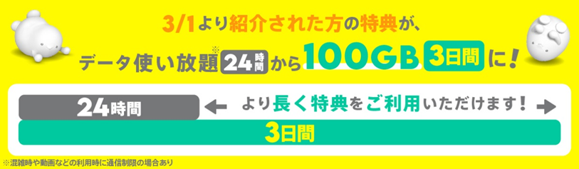 紹介された方がSIMを有効化すると、「データボーナス3GB(30日間)」を自動適用します。(最大10名さままで)