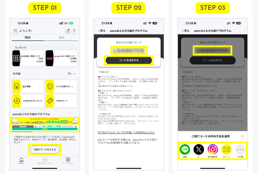 ② 表示された8桁のご紹介コードの下にある「コードを共有する」をタップ