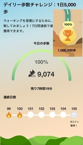 povoウォーキングを始めて、ついに、デイリー歩数チャレンジ(5000歩/日)の連続「100日」を達成しました。